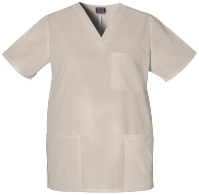 This Unisex V-neck top has one chest pocket and two patch pockets. Side vents. Center back length 29".